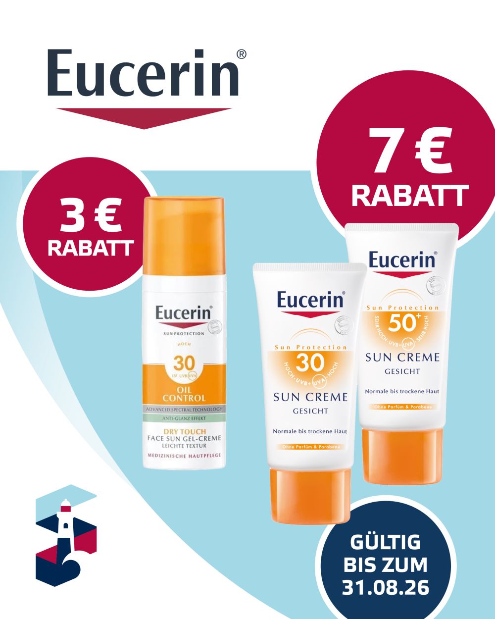 3 € Rabatt beim Kauf eines Sonnenprodukts von Eucerin und 7 € Rabatt beim Kauf von zwei Sonnenprodukten